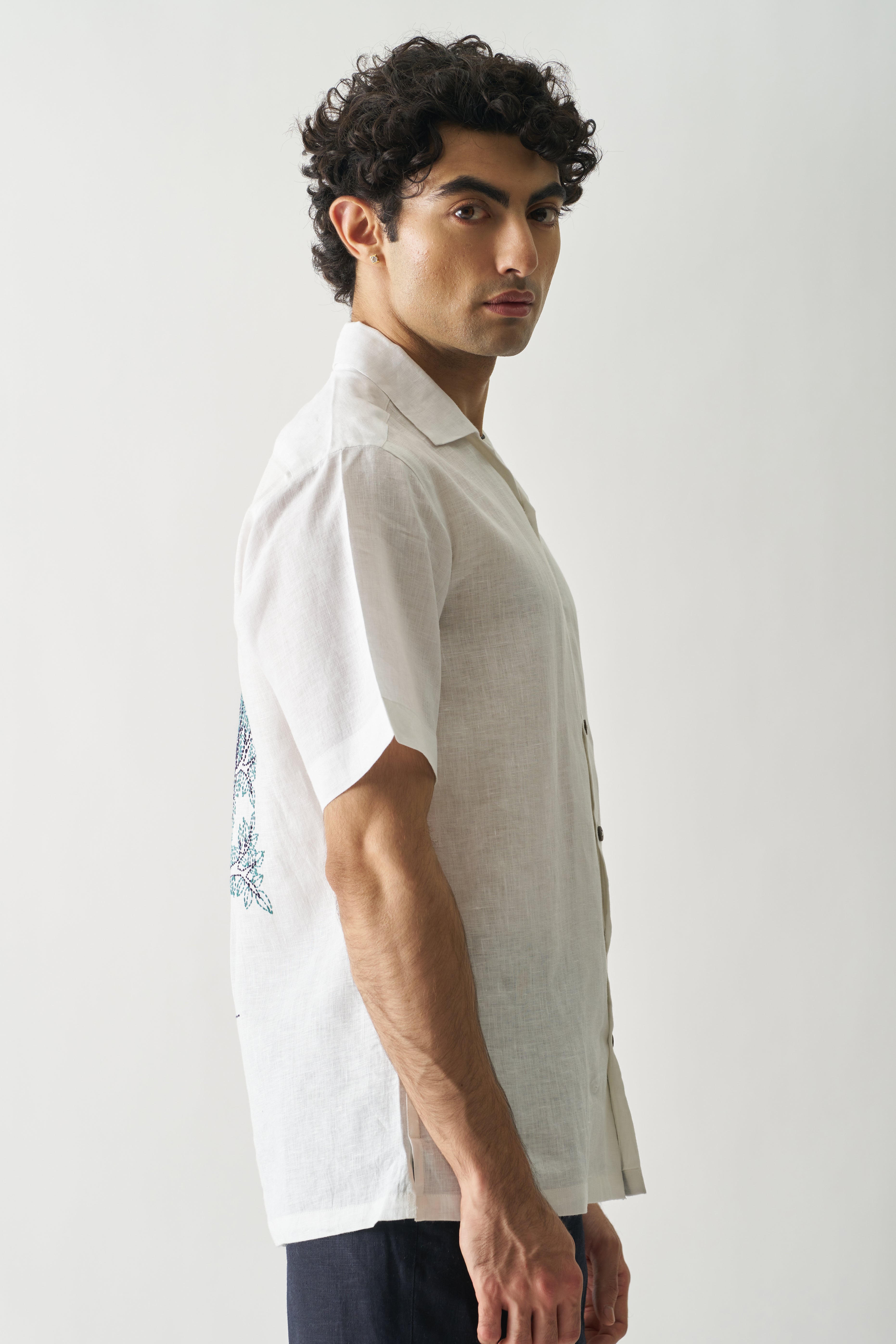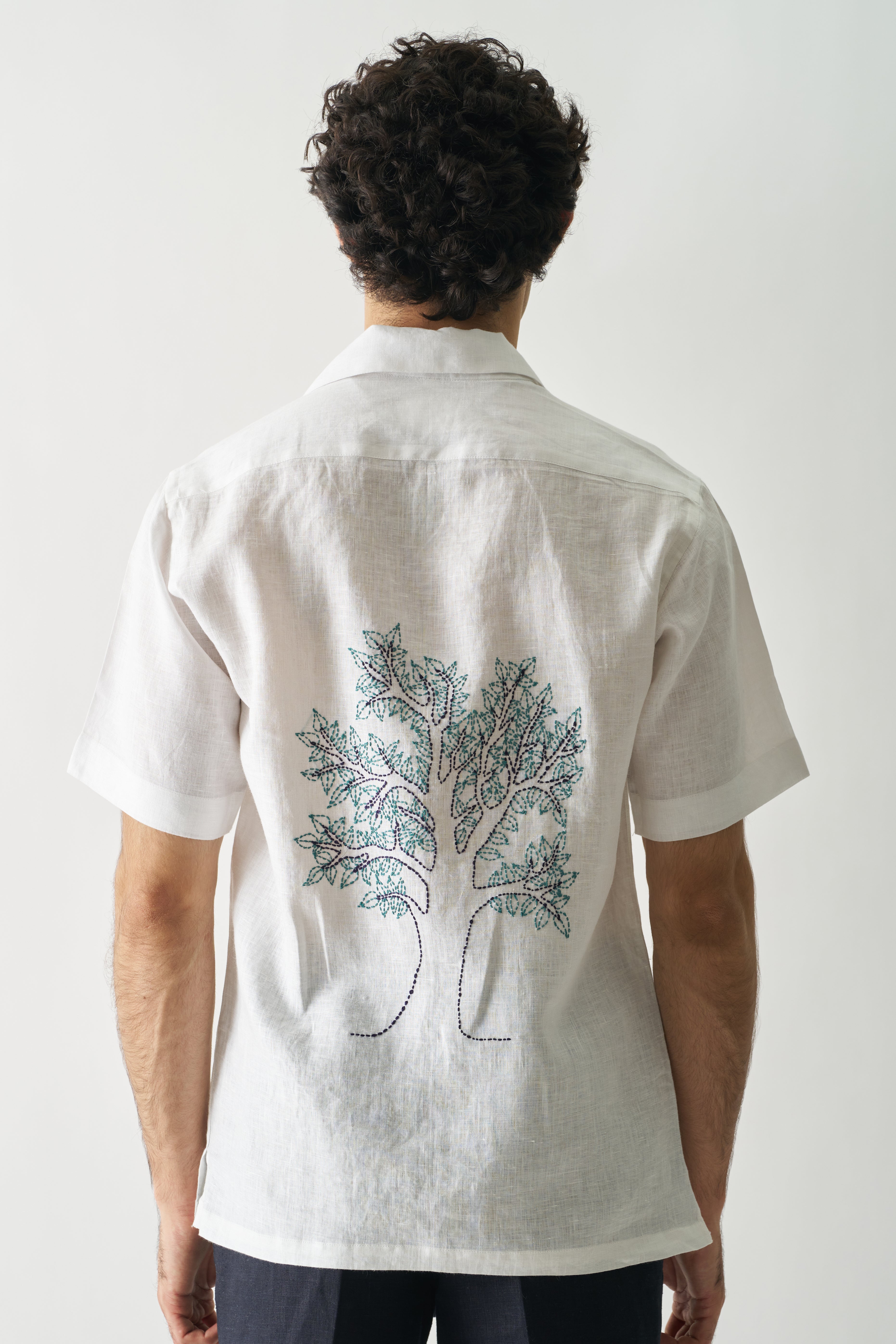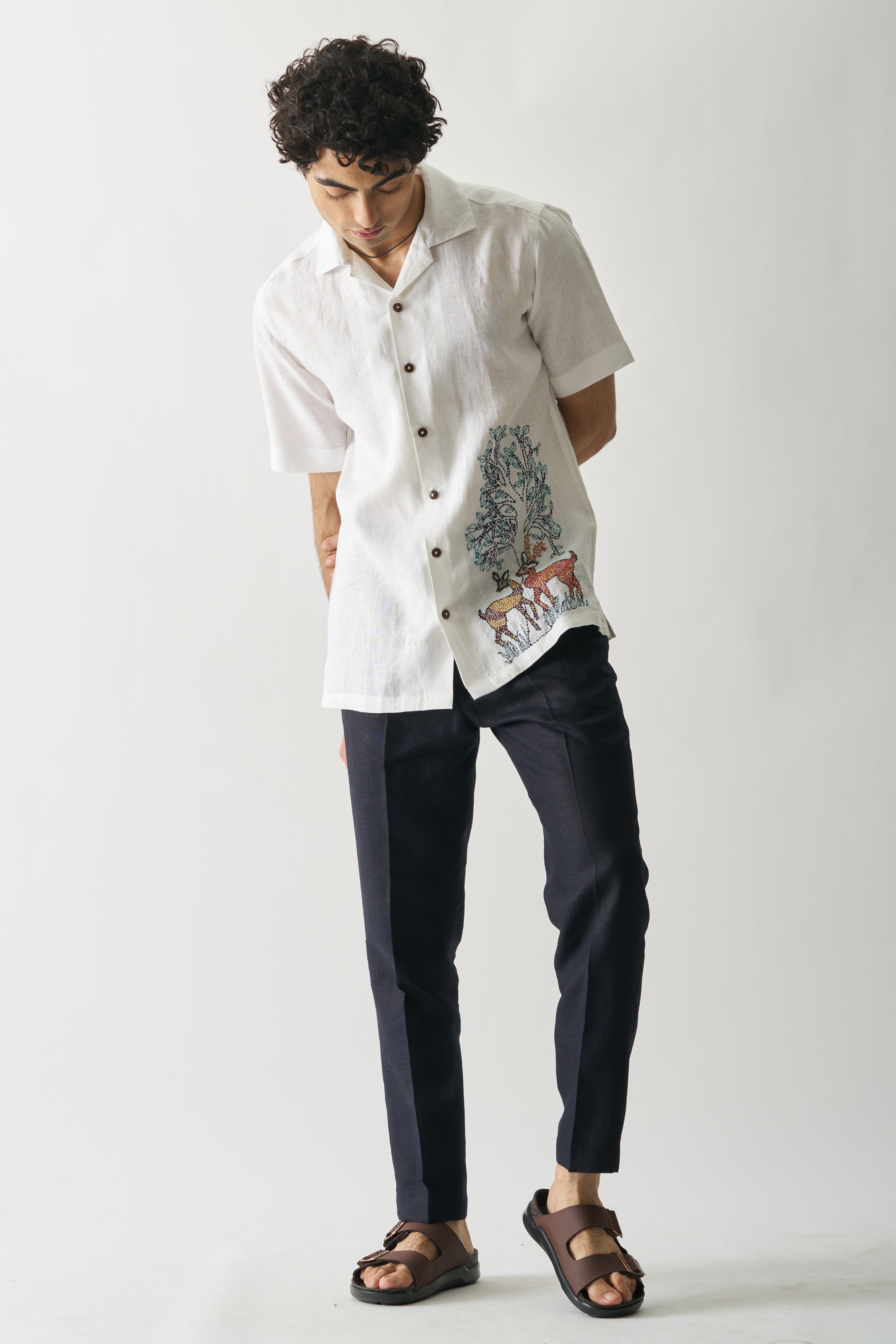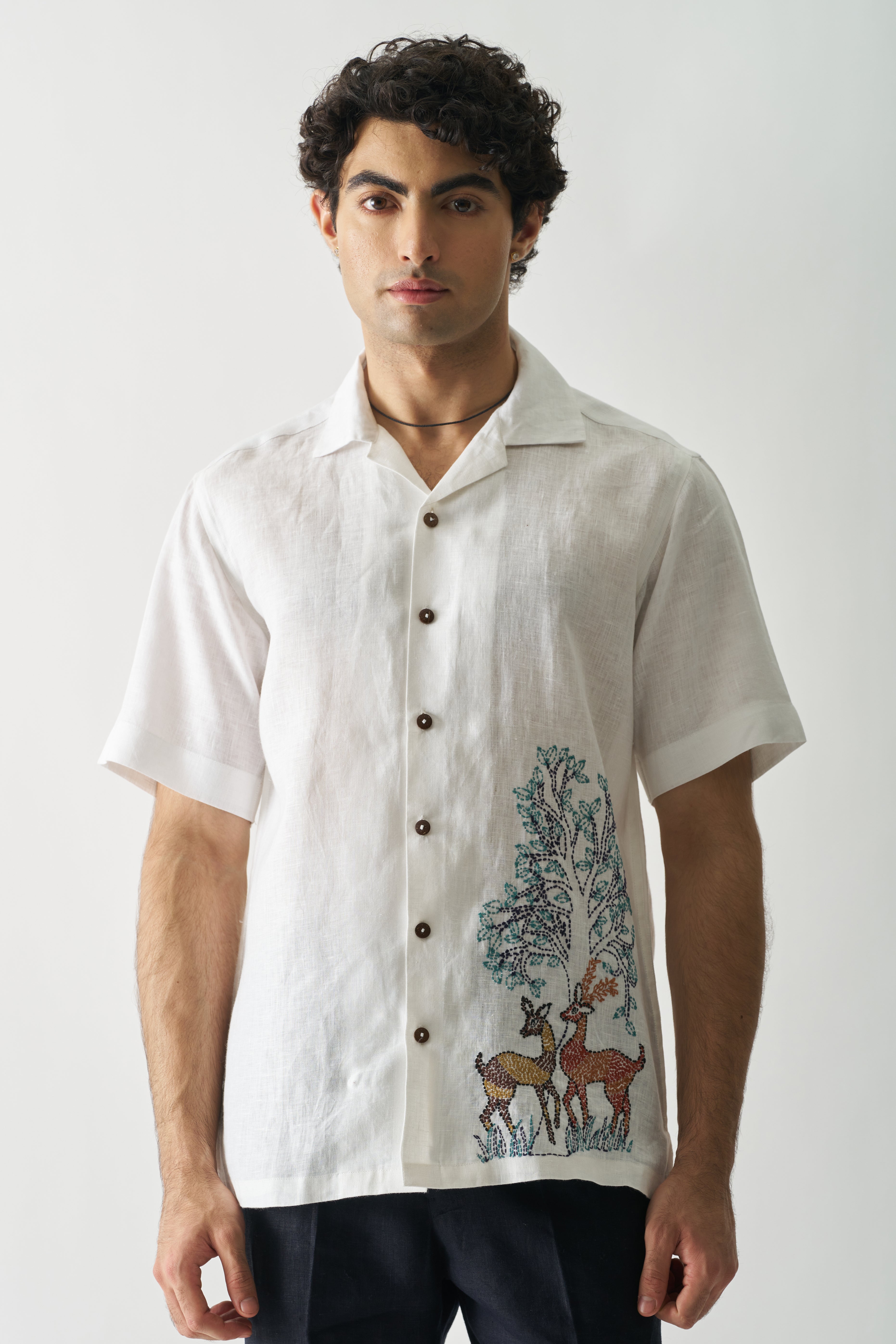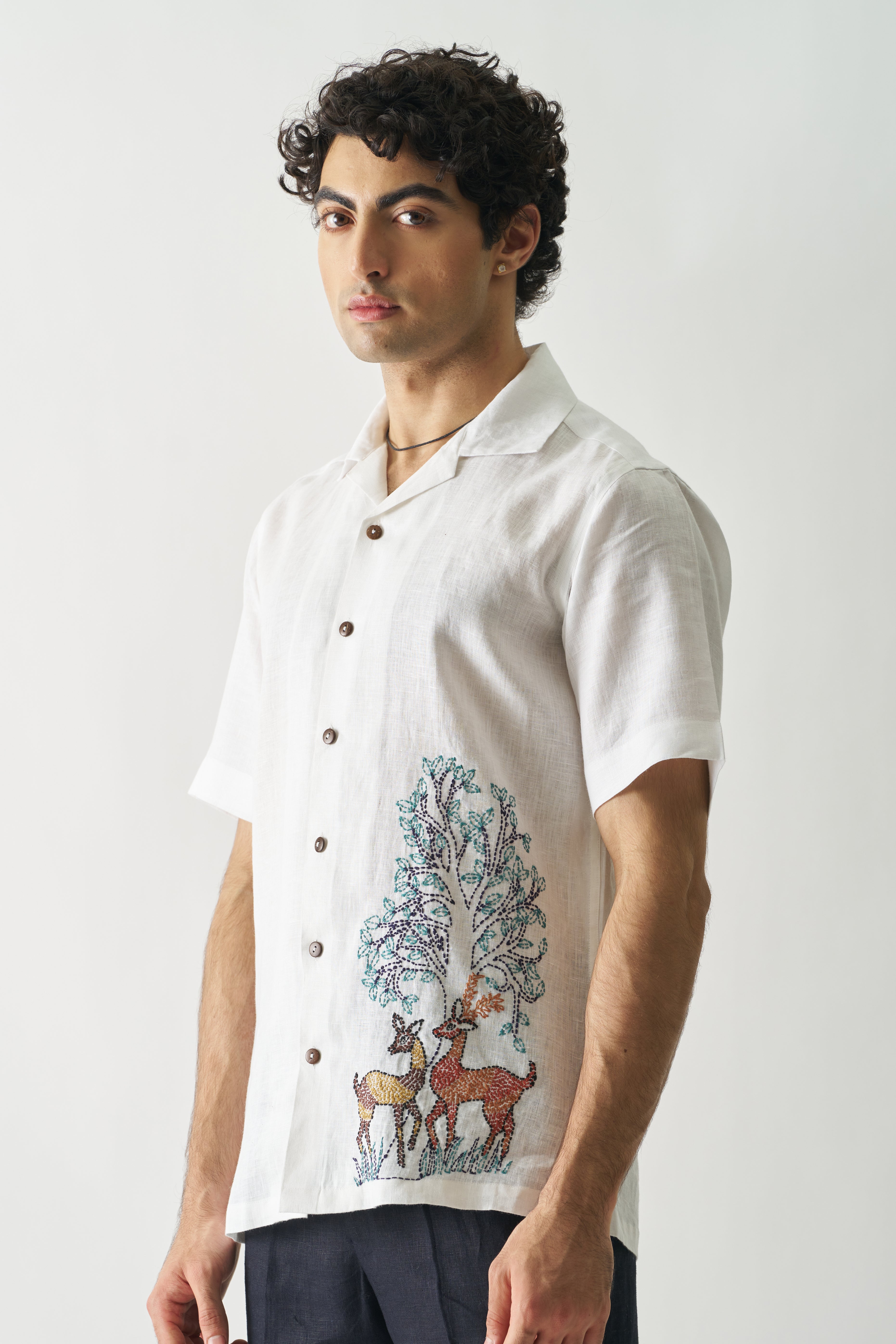 "Enter a world of wonder with our white linen shirt, adorned with a hand-embroidered illustration of a deer under a tree on the front and a towering, stately tree on the back. This beautiful design brings the wonder of the forest to life, fusing artistry and sophistication. Take your fashion to the next level with this one-of-a-kind piece that honors the wonder and beauty of nature."
