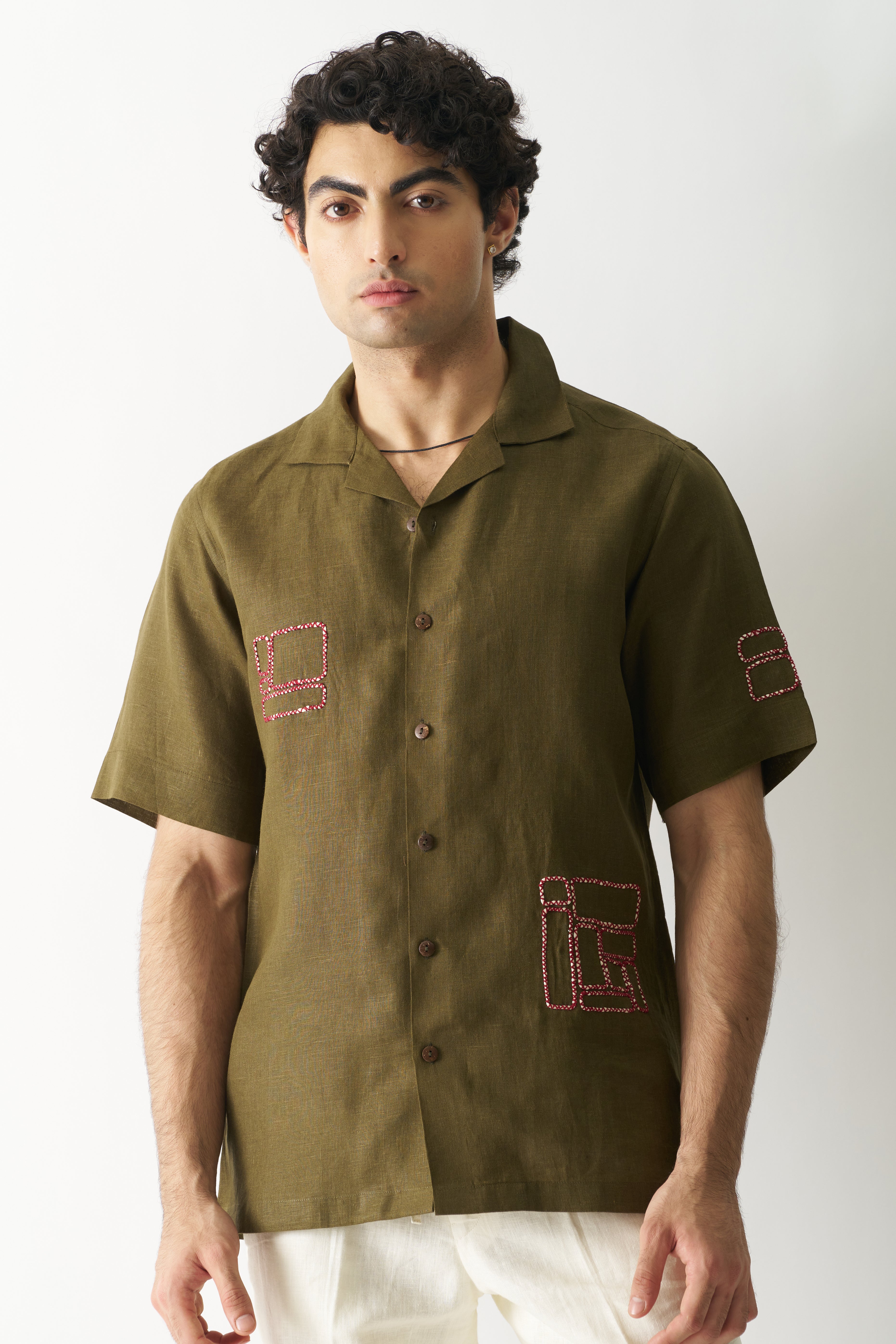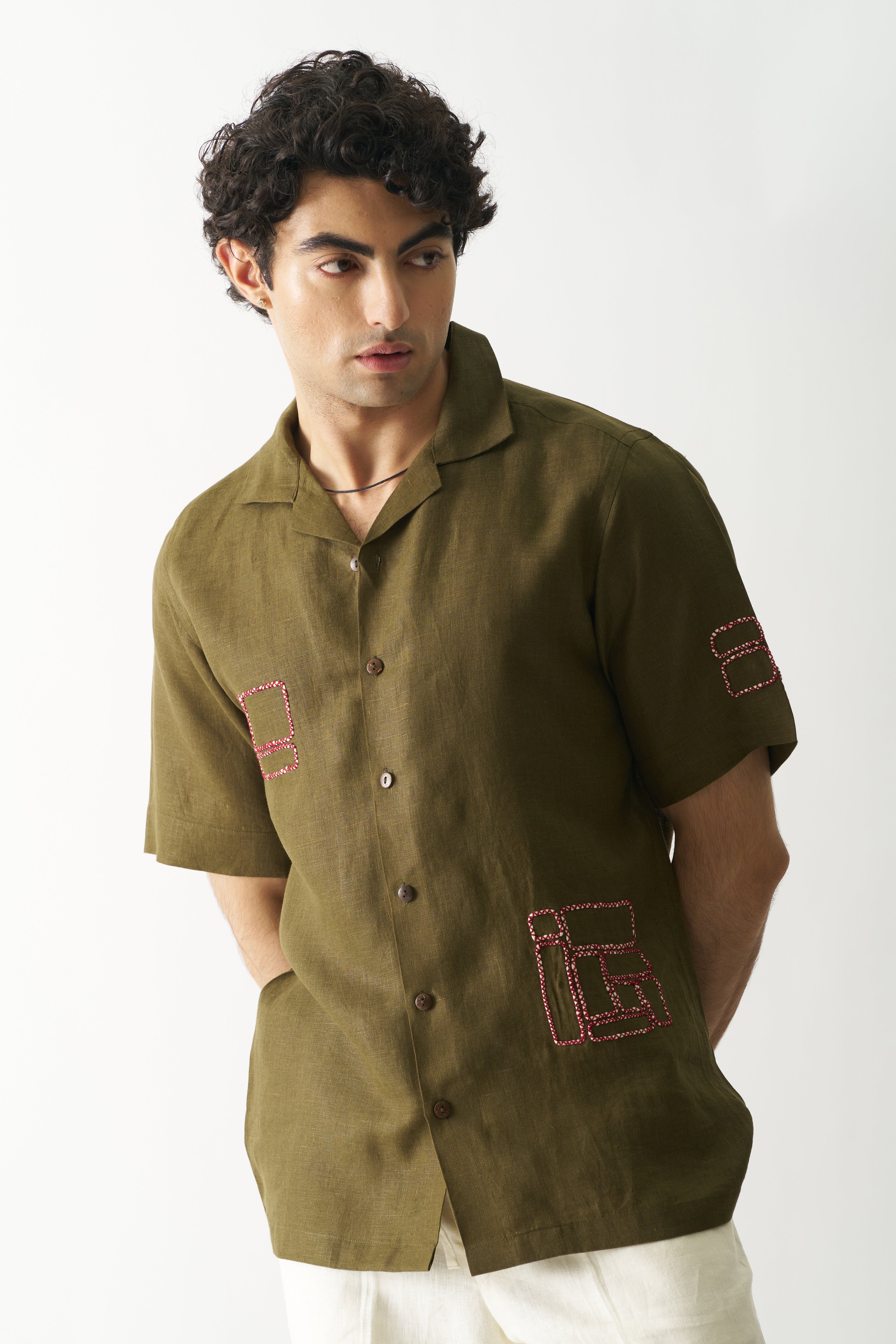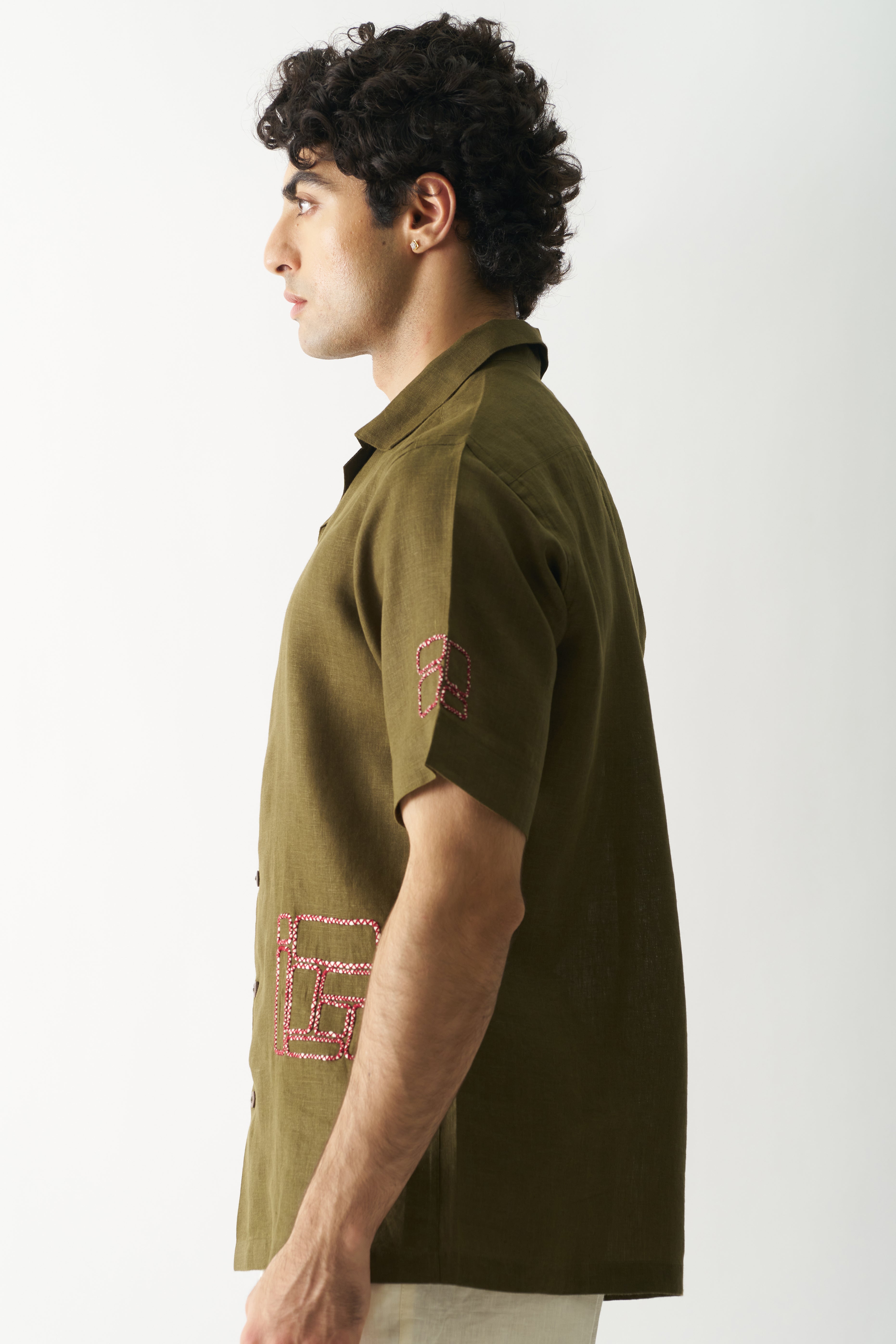 Elevate your fashion sense with our Hand-Embroidered Dark Olive Green Shirt, embellished with elaborate square and rectangle motifs on the sleeves and front. An exemplary blend of class and handwork, it adds class to every detail.
