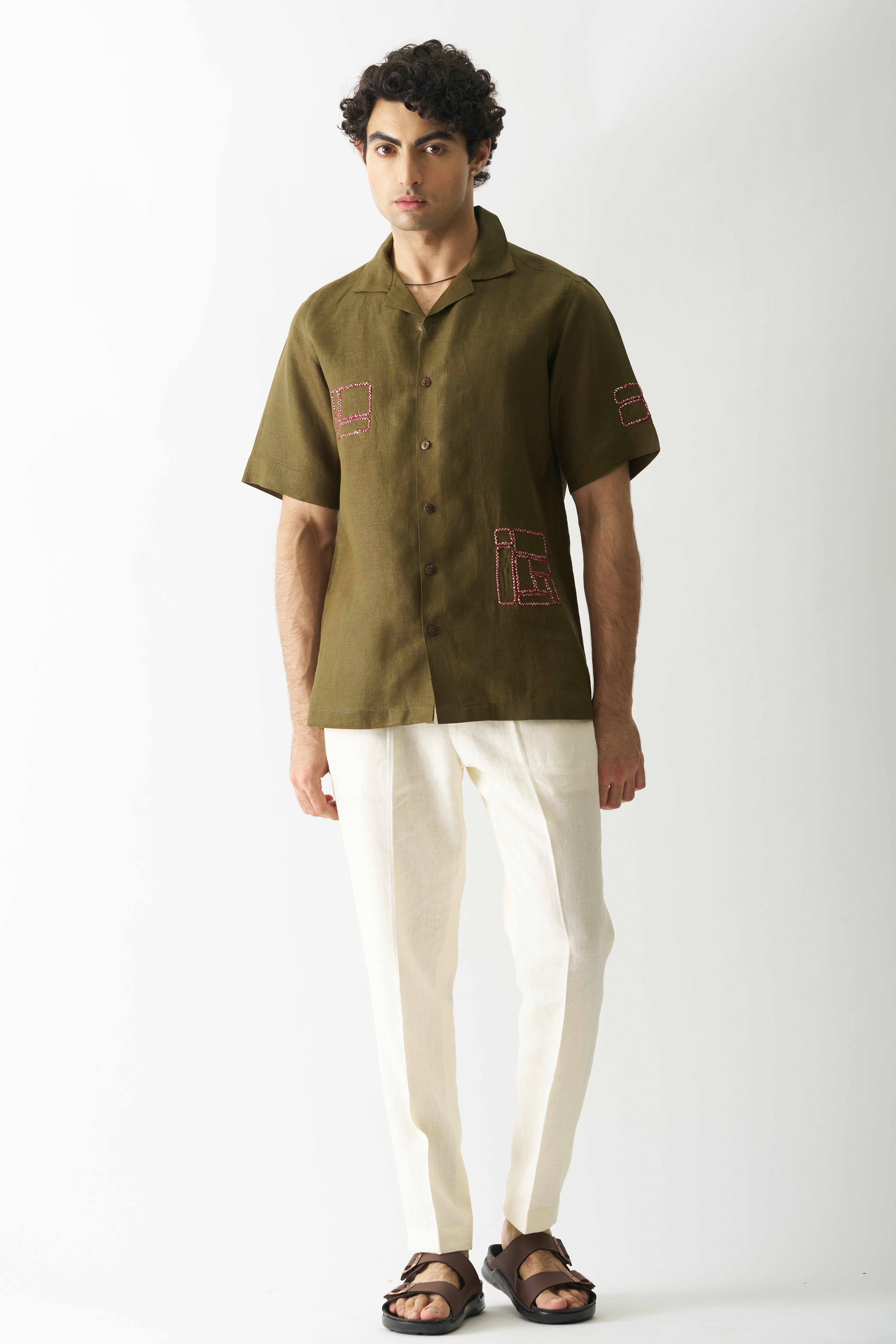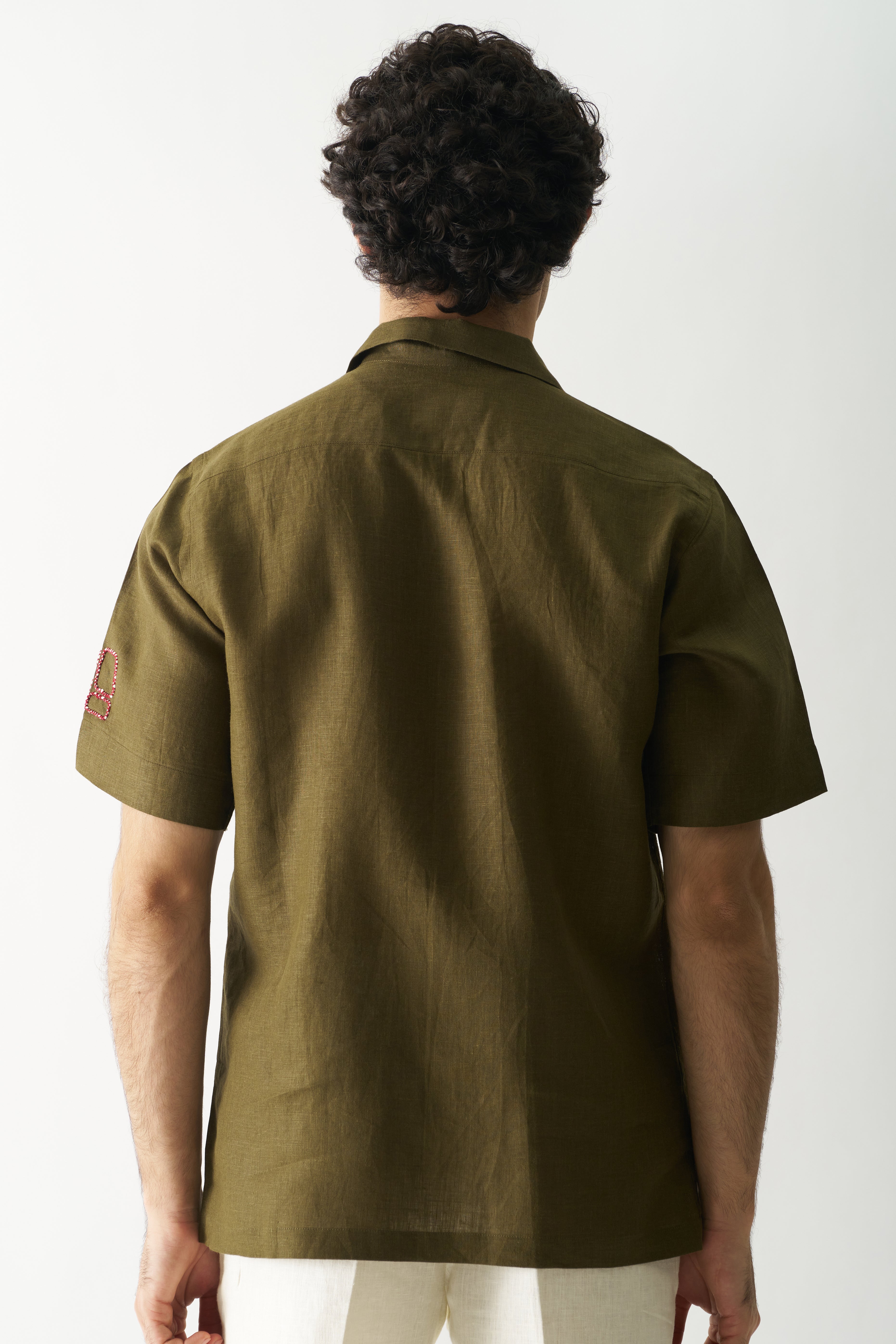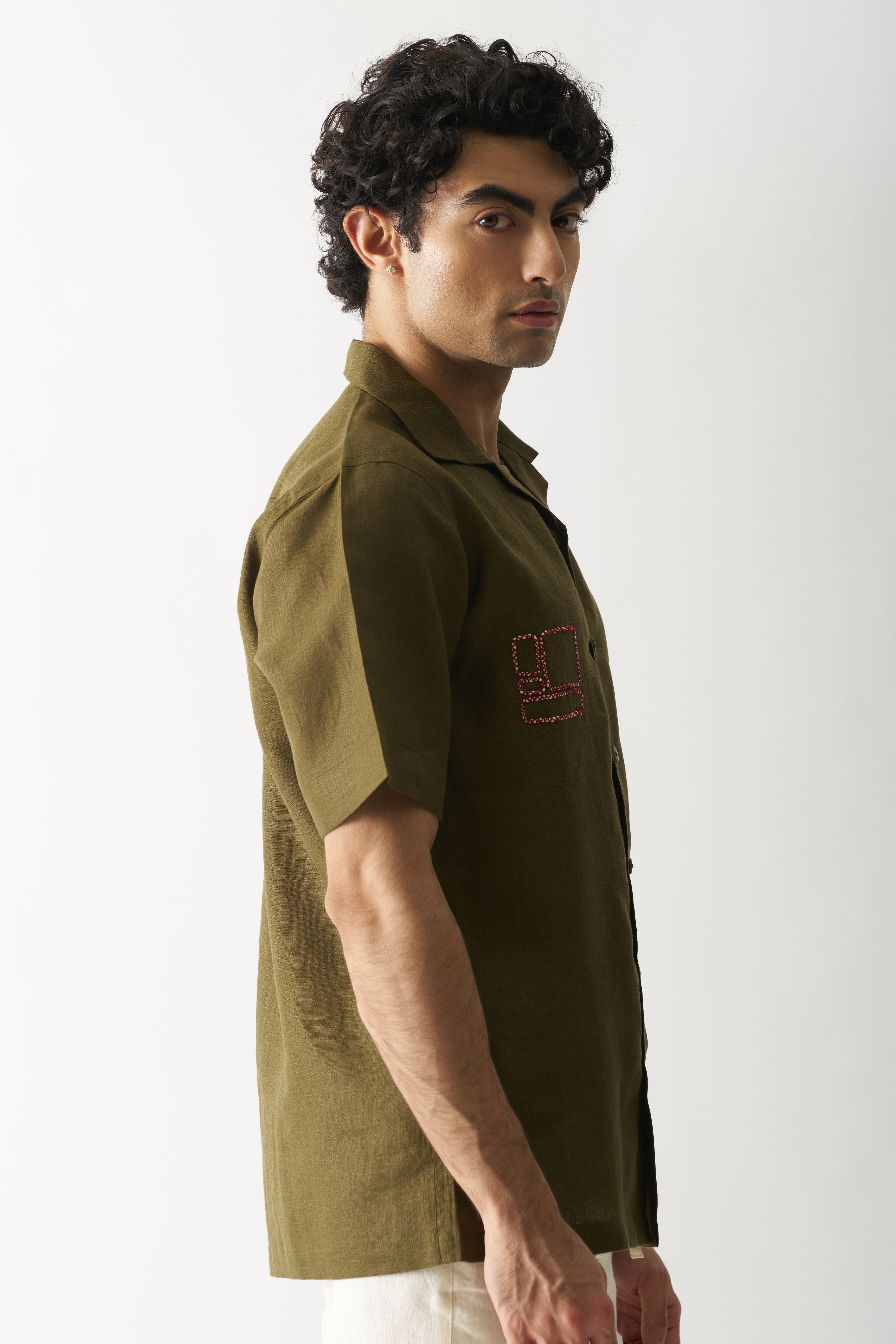 Elevate your fashion sense with our Hand-Embroidered Dark Olive Green Shirt, embellished with elaborate square and rectangle motifs on the sleeves and front. An exemplary blend of class and handwork, it adds class to every detail.