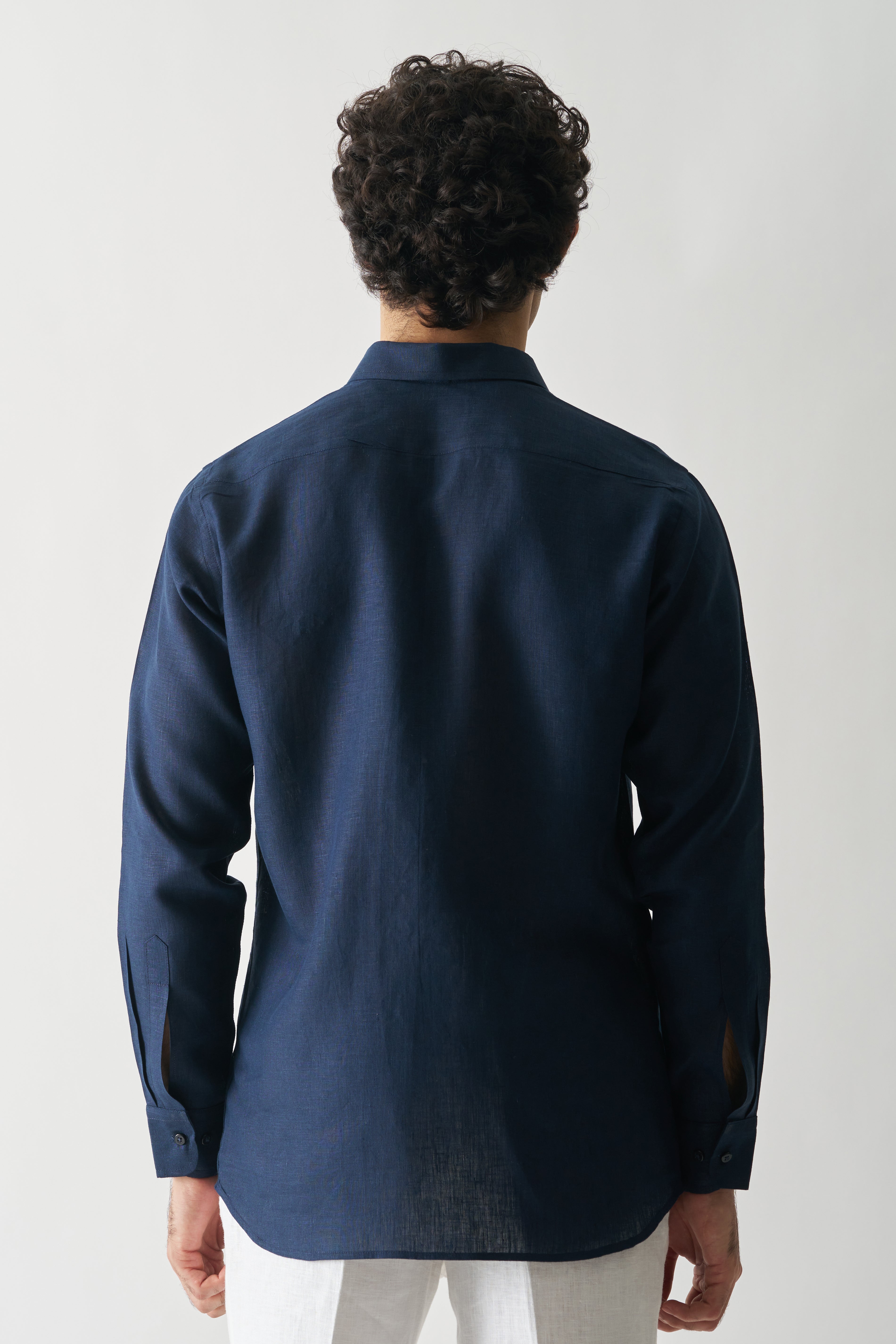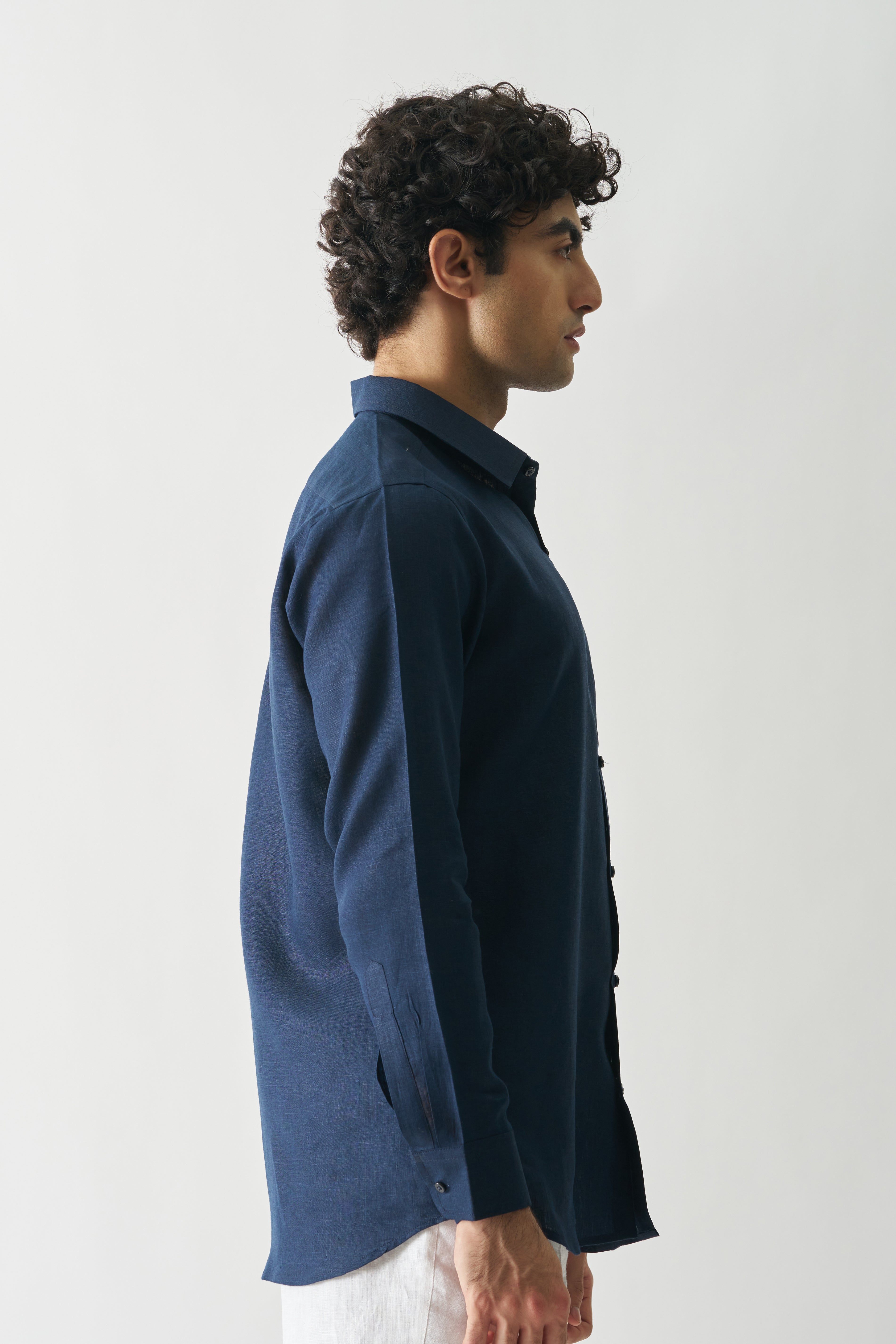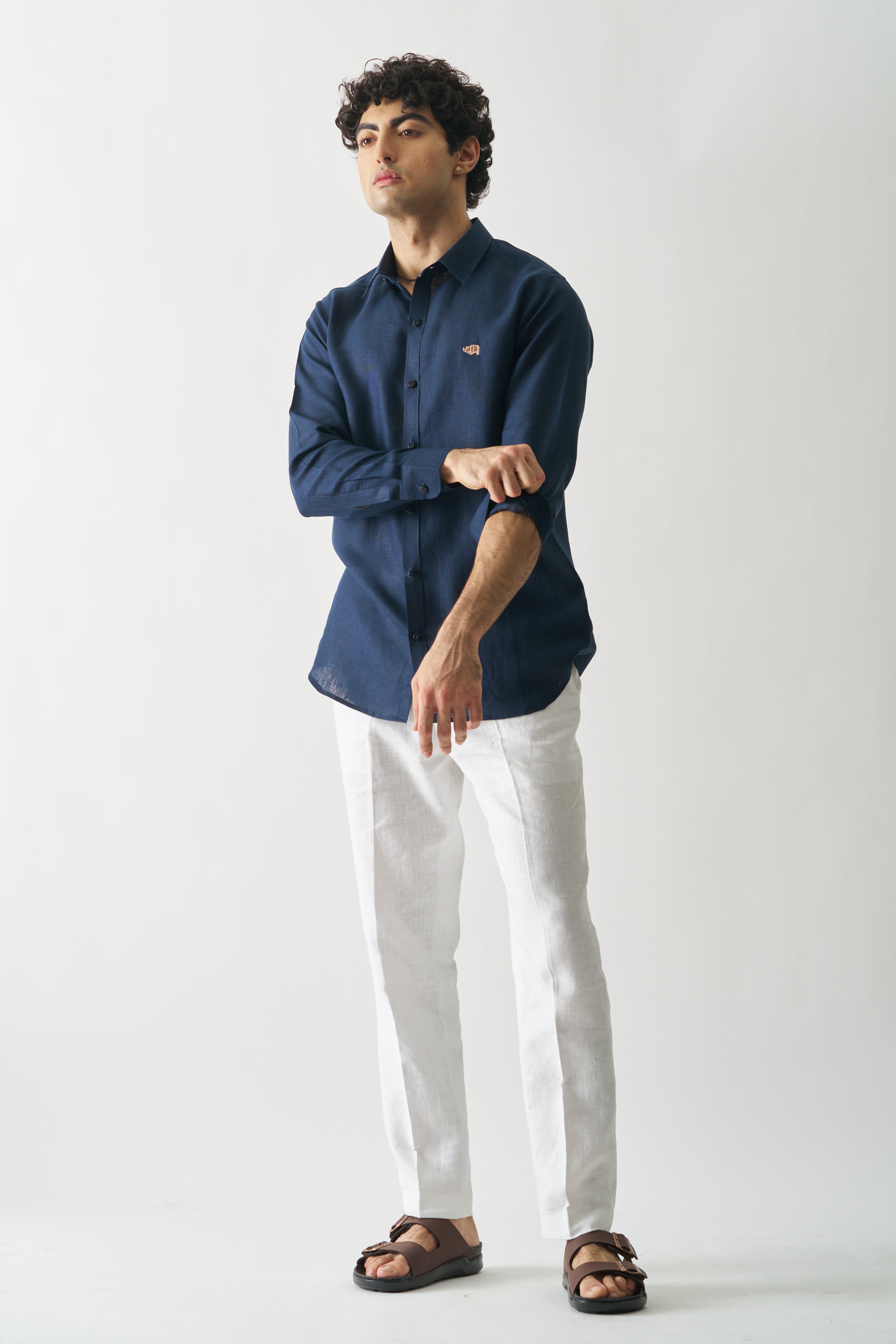 Add a touch of sophistication to your daily wardrobe with our refined navy blue full-sleeve linen shirt featuring a traditional regular collar. It is a multi-purpose piece that goes well with our white linen pants, creating a classic timeless piece from our Rozzana collection of timeless linen fashion.